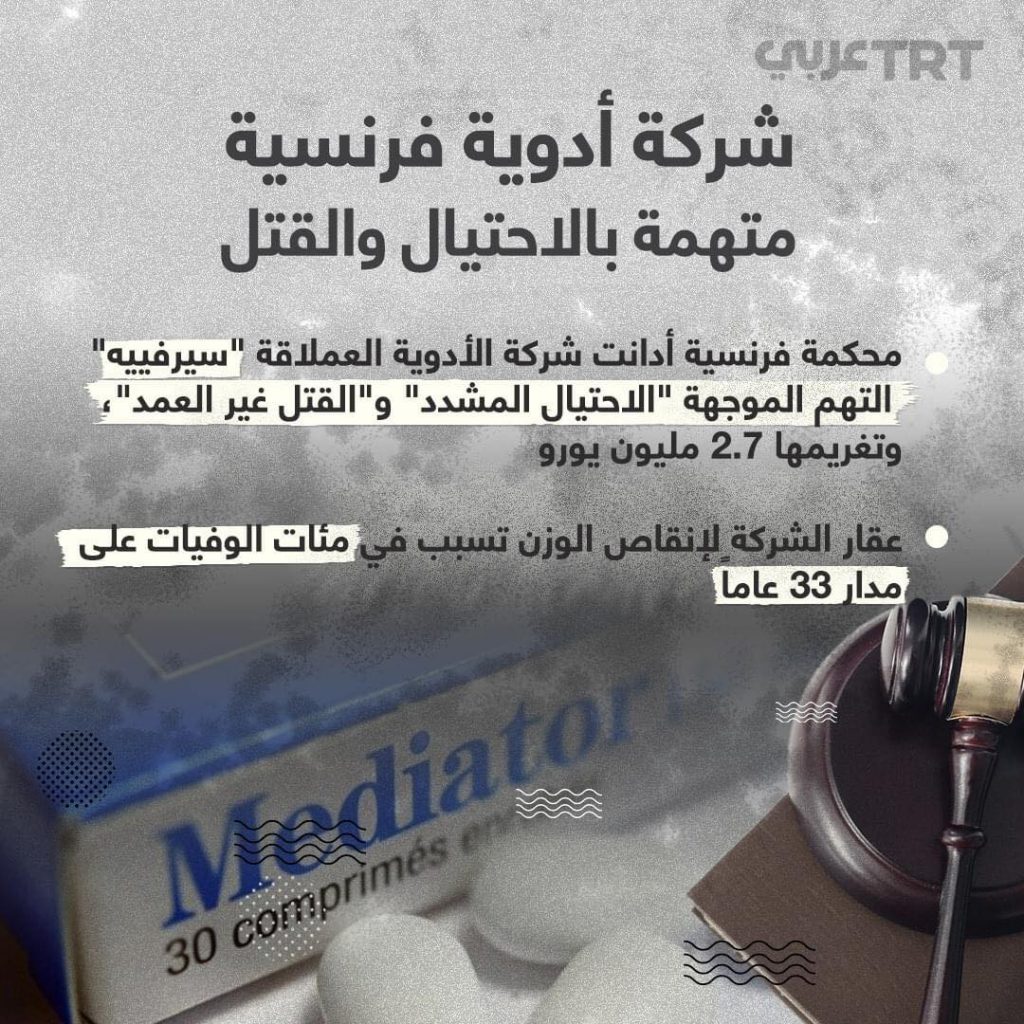 วันที่ 29 มี.ค. บีบีซี รายงานว่า เซอร์เวียร์ บริษัทเภสัชกรรมสัญชาติฝรั่งเศส ถูกพบมีความผิดในข้อหาฉ้อโกงร้ายแรง และฆ่าผู้อื่นโดยไม่เจตนา จากการผลิตยา มีเดียเตอร์ ยาลดน้ำหนักที่พัฒนาเพื่อใช้รักษาโรคเบาหวานน้ำหนักเกิน (overweight diabetics) และวางจำหน่ายในท้องตลาดนาน 33 ปี (2519-2552)