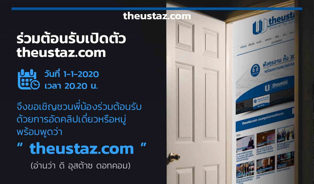 ร่วมต้อนรับเปิดตัว theustaz.com วันที่ 1-1-2020 เวลา 20.20 น. 24/12/2019 / ประชาสัมพันธ์ ประกวด “วัยรุ่นวุ่นอัลกุรอาน” ตอนที่ 1 23/12/2019 / ทางนำ, ประชาสัมพันธ์, อัลกุรอาน ‹ 1 … 4 5 6