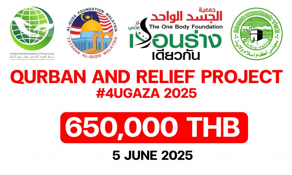 (3) Al-Quds Foundation-Malaysia จำนวน 650,000 บาท เพื่อสมทบโครงการกุรบาน 1446 ฮิจเราะห์ศักราช และอาหารถุงยังชีพ โดยมี Dr. Sharif Abu Shammalah ประธานมูลนิธิ ฯเป็นผู้รับมอบ” ประธานมูลนิธิเรือนร่างเดียวกันกล่าวเพิ่มเติม