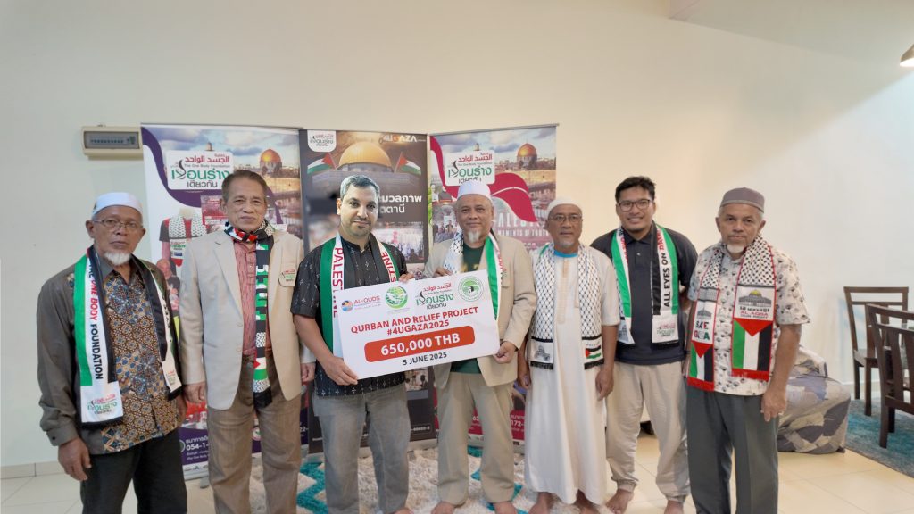 (3) Al-Quds Foundation-Malaysia จำนวน 650,000 บาท เพื่อสมทบโครงการกุรบาน 1446 ฮิจเราะห์ศักราช และอาหารถุงยังชีพ โดยมี Dr. Sharif Abu Shammalah ประธานมูลนิธิ ฯเป็นผู้รับมอบ” ประธานมูลนิธิเรือนร่างเดียวกันกล่าวเพิ่มเติม
