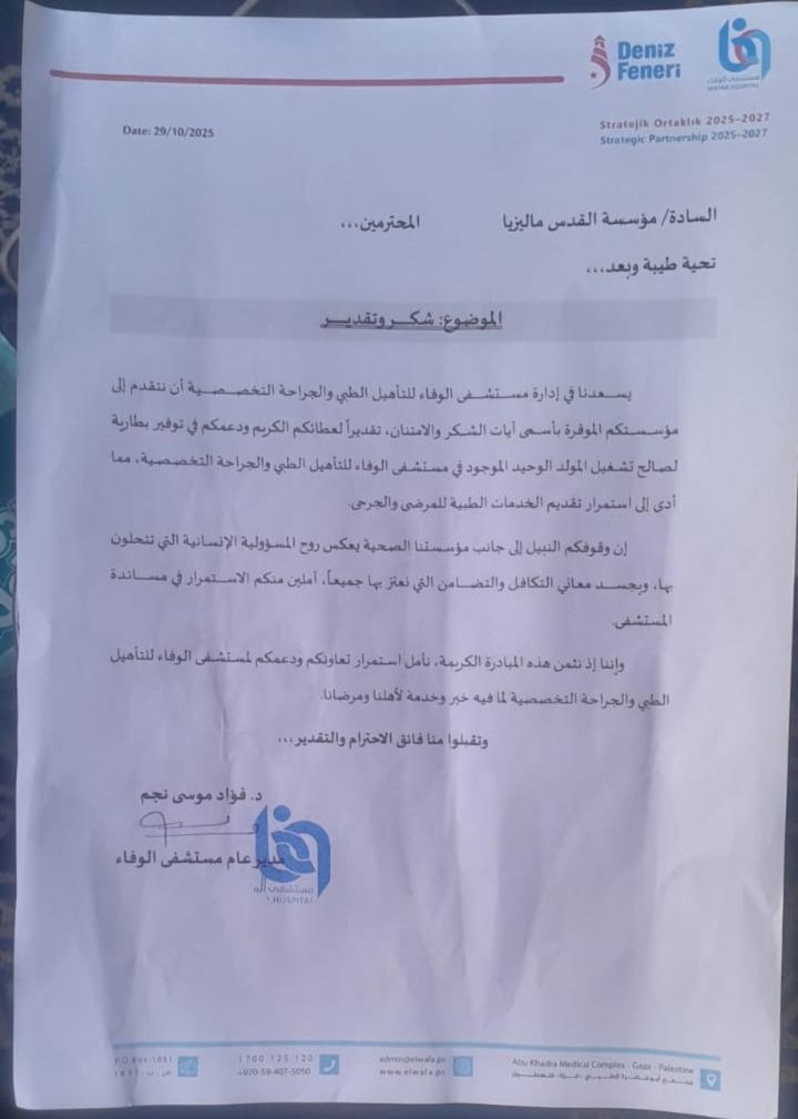 1. ซื้อเครื่องผลิตกระแสไฟฟ้าและอุปกรณ์ทางการแพทย์ให้แก่ AL-Wafa Hospital