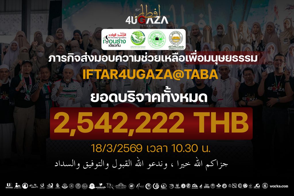 “บรรดาการสรรเสริญ เป็นสิทธิ์ของอัลลอฮ์ ผลจากการจัดงาน 4UGAZA@TABA เมื่อวันที่ 15 กุมภาพันธ์ที่ผ่านมา เราสามารถระดมเงินบริจาคจำนวน 2,542,222 บาท ส่วนการบริจาคที่เกิดขึ้นหลังจากนี้ มูลนิธิ ฯ จะจัดสรรในโครงการต่อไป إن شاء الله จึงใคร่ถือโอกาสนี้ขอบคุณทุกท่านที่มีส่วนร่วมในการทำความดีครั้งนี้ และขอเชิญชวนพี่น้องบริจาคเพื่อชาวกาซ่าอย่างต่อเนื่องผ่านบัญชีทางการของมูลนิธิ” ประธานมูลนิธิเรือนร่างเดียวกันกล่าวทิ้งท้าย