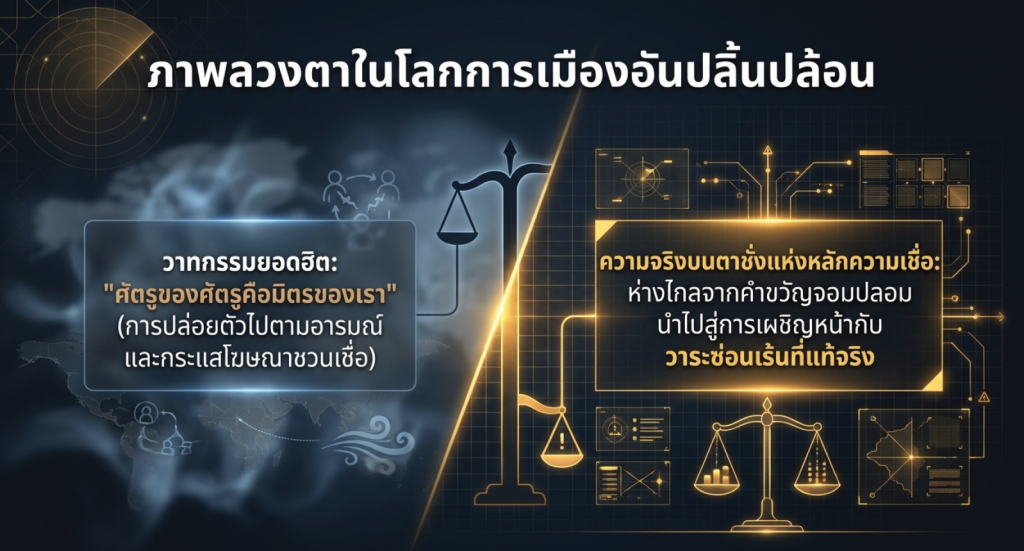 ในโลกของการเมืองและสงครามอันปลิ้นปล้อน บางคนเคลิ้มกับวาทกรรม “ศัตรูของศัตรูคือมิตรของเรา” แต่ในตาชั่งแห่งหลักความเชื่อและวิจารณญาณ เรื่องนี้ต่างออกไปโดยสิ้นเชิง นี่คือเรื่องราวจากมุมจริง ห่างไกลจากเสียงตะโกนของคำขวัญอันจอมปลอม