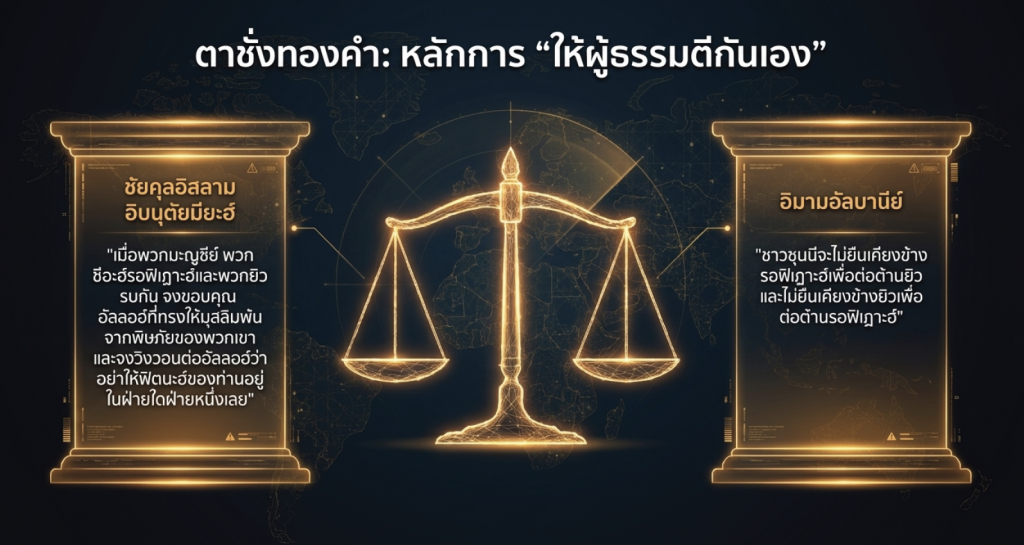 👉 และนักหะดีษ อิมามอัลบานีย์ – ขออัลลอฮ์เมตตาท่าน – กล่าวว่า: ชาวซุนนีจะไม่ยืนเคียงข้างรอฟิเฎาะฮ์เพื่อต่อต้านยิว และไม่ยืนเคียงข้างยิวเพื่อต่อต้านรอฟิเฎาะฮ์