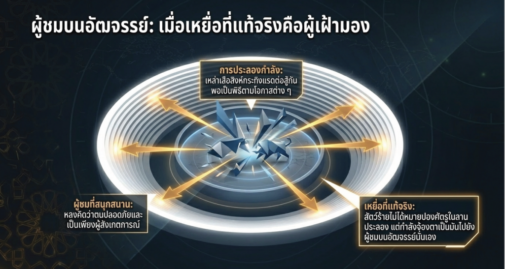 – ความเป็นเด็กอมมือของประชาขาติอิสลามโดยเฉพาะประเทศอ่าวที่กลายเป็นลูกไก่ในกำมือ บีบก็ตาย คลายก็รอด แต่ยังสนุกสนานกับการเป็นผู้ชมบนอัฒจรรย์ของการต่อสู้ของเหล่าเสือสิงห์กระทิงแรด ที่พวกมันอาจประลองฝีมือและพละกำลังตามโอกาสต่าง ๆ พอเป็นพิธี แต่เหยื่อที่พวกมันหมายปอง จ้องตาเป็นมัน หาใช่ใครอื่น นอกจากผู้ชมบนอัฒจรรย์นั่นเอง