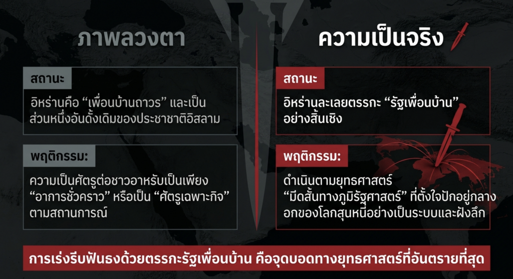 การเร่งรีบฟันธงข้อมูลเชิงยุทธศาสตร์และประวัติศาสตร์ จะเผยให้เห็นการละเลยความจริงที่ชัดเจน นั่นคือ อิหร่านไม่เคยปฏิบัติตัวด้วยตรรกะ “รัฐเพื่อนบ้าน” แต่ดำเนินตามยุทธศาสตร์ “มีดสั้นทางภูมิรัฐศาสตร์” ที่ปักอยู่กลางอกของโลกสุนหนี่มาโดยตลอด ต่อไปนี้คือการหักล้างความคลาดเคลื่อนเหล่านี้จากเหตุการณ์ล่าสุดย้อนไปถึงรากเหง้าของปัญหา