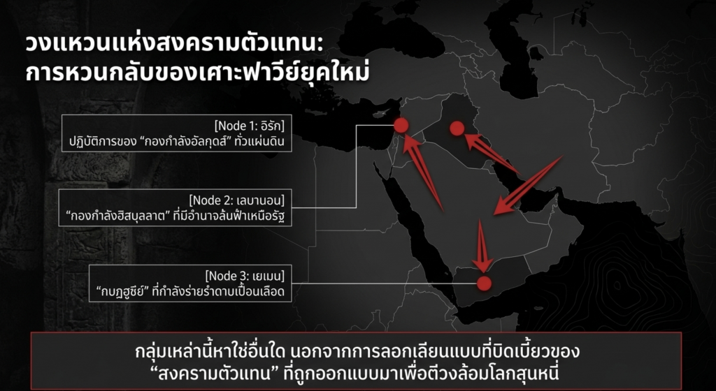 ปฏิบัติการของ “กองกำลังอัลกุดส์” ทั่วแผ่นดินอิรักทุกวันนี้ “กองกำลังฮิสบุลลาต” ที่มีอำนาจล้นฟ้าเหนือเลบานอน ตลอดจน “กบฏฮูซีย์” ที่กำลังร่ายรำดาบเปื้อนเลือดบนแผ่นดินเยเมน หาใช่อื่นใดนอกจากการลอกเลียนแบบที่บิดเบี้ยวของ “สงครามตัวแทน” เท่านั้น