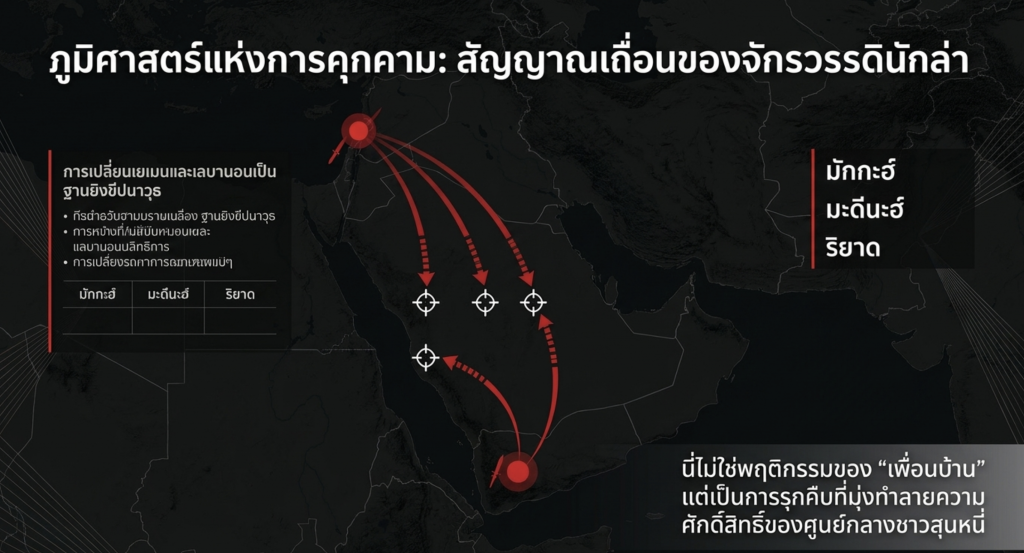 การเปลี่ยนเยเมนและเลบานอนเป็นฐานยิงขีปนาวุธที่เล็งเป้าไปยังมักกะฮ์ มะดีนะฮ์และริยาด ไม่ใช่พฤติกรรมของ “เพื่อนบ้าน” ด้วยประการทั้งปวง แต่เป็นสัญญานเถื่อนของ “จักรวรรดินักล่าที่กำลังรุกคืบ“ โดยมุ่งทำลายความศักดิ์สิทธิ์ของศูนย์กลางชาวสุนหนี่