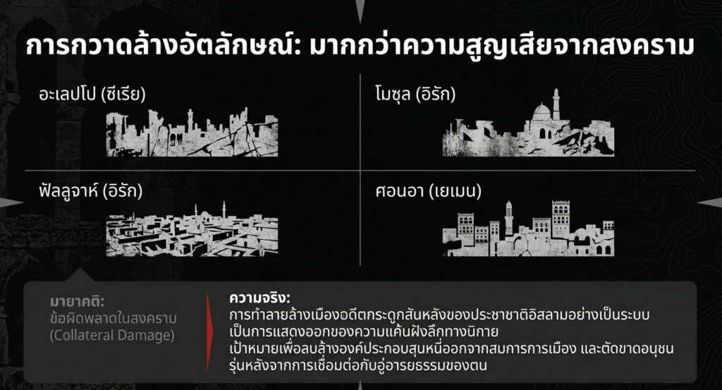สิ่งที่เกิดขึ้นในซีเรีย เยเมนและอิรักจากการทำลายล้างเมืองอดีตกระดูกสันหลังของประขาชาติอิสลามอย่างเป็นระบบ (อะเลปโป โมซุล ฟัลลูจาห์และศอนอา) และการกวาดล้างอัตลักษณ์และวัฒนธรรมอันเก่าแก่ของชาติที่เคยเป็นอู่อารยธรรมของโลก ไม่ใช่เป็น “ข้อผิดพลาดในสงคราม” แต่เป็นการแสดงออกของความแค้นฝังลึกทางนิกายที่มีเป้าหมายลบล้างองค์ประกอบของสุนหนี่ออกจากสมการการเมือง