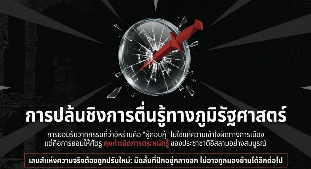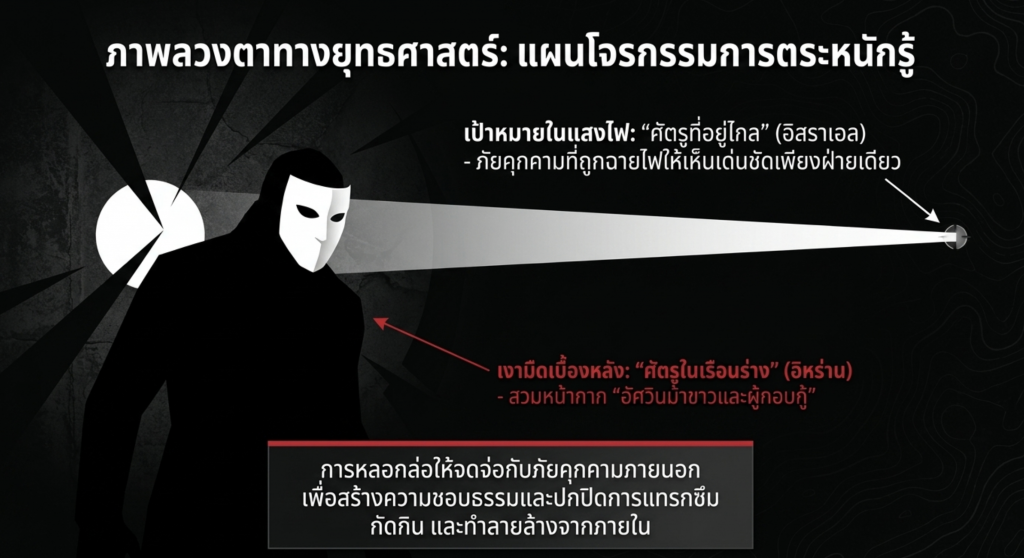 การพยายามโน้มน้าวชาวสุนหนี่ว่า “ศัตรูที่อยู่ไกล (อิสราเอล)” คือภัยคุกคามเพียงฝ่ายเดียว ขณะที่ “ศัตรูที่อาศัยอยู่ในเรือนร่างของเรา (อิหร่าน) คือ “อัศวินม้าขาวในฐานะผู้กอบกู้แต่เพียงผู้เดียว คือ “การปล้นชิงการตื่นรู้ทางภูมิรัฐศาสตร์” ของประชาชาติอย่างสมบูรณ์